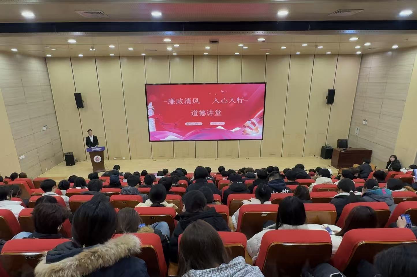 12月23日,数字经济学院学生党支部“青扬”宣讲团精心策划并成功举办了第六次实践活动——“廉政清风,入心入行”道德讲堂廉政教育专题活动。本次活动旨在通过丰富多元的形式载体,深化全院师生对廉政文化的认知与认同,积极营造风清气正的校园生态,为培养德才兼备的新时代青年筑牢思想根基。