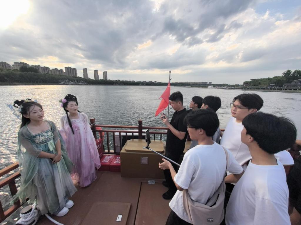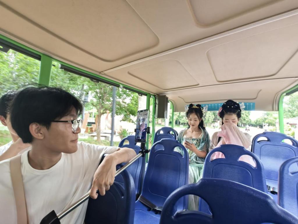 体验类直播走进淇澳翠境园,在古色古香的鹿台阁前,两位身着汉服的团员作为“文旅向导”,搭乘游园车并泛舟画舫,实时展示园区建筑风貌与淇水两岸自然景观,穿插汉服穿搭与打卡互动,让观众云端感受诗经地域的人文底蕴。
